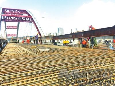 记者在现场看到,40多名工人正在富乐大桥两头制作和安装桥面板钢筋(如图)。据了解,该项工作是现浇桥面板的重要一步,随后将进行混凝土浇筑和养护。此外,与现浇桥面板同时进行施工的还有钢纵梁的安装,目前已经完成20%,预计在7月底完成该项工作。施工现场工程部负责人白伟表示,安装钢纵梁的目的是增强桥面稳定性,减小行车时桥面的振动幅度。