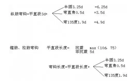 通过上图可以看出,纵筋的弯钩和 箍、拉筋弯钩 算法是有区别的,即箍筋、拉筋的平直段长度要区分抗震和非抗争。